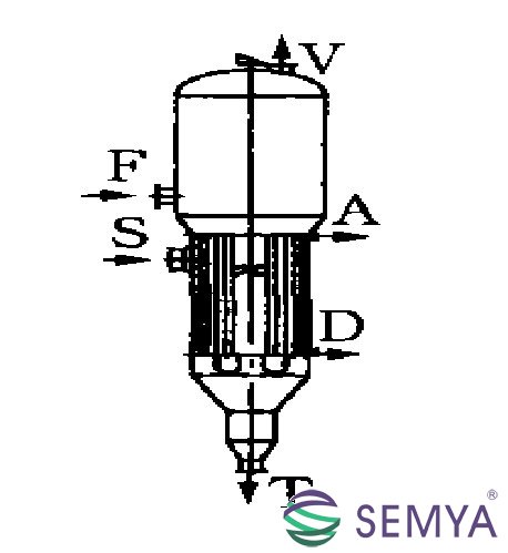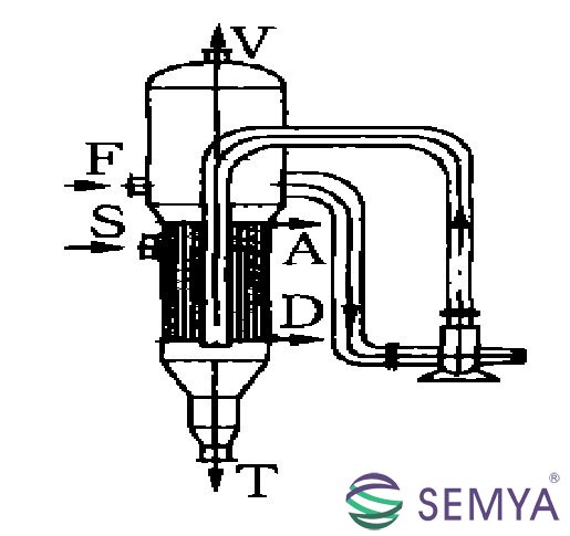 圖1 中央循環管式蒸發器 S-加熱蒸汽;F-料液;V -二次蒸汽;A-不凝汽;D -冷凝液;T-蒸發完成液