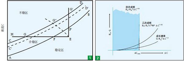 根據(jù)大量試驗的結(jié)果證實,溶液的過飽和與結(jié)晶的關(guān)系可用上圖1表示;圖中的AB 線為普通的溶解度曲線,CD 線代表溶液過飽和而能自發(fā)地產(chǎn)生晶核的濃度曲線( 超溶解度曲線),它與溶解度曲線大致平行。這兩根曲線將濃度——溫度圖分割為三個區(qū)城。在 AB 曲線以下是穩(wěn)定區(qū),在此區(qū)中溶液尚未達到飽和,因此沒有結(jié)晶的可能。AB 線以上為過飽和溶液區(qū),此區(qū)又分為兩部分:在 AB 與 CD 線之間稱為介穩(wěn)區(qū),在這個區(qū)域中,不會自發(fā)地產(chǎn)生晶核,但如果溶液中已加了晶種, 這些晶種就會長大。 CD 線以上是不穩(wěn)區(qū),在此區(qū)域中,溶液能自發(fā)地產(chǎn)生晶核。若原始濃度為 E 的潔凈溶液在沒有溶劑損失的情況下冷卻到 F 點,溶液剛好達到飽和,但不能結(jié)晶,因為它還缺乏作推動力的過飽和度。從F 點繼續(xù)冷卻到 G 點的一段期間,溶液經(jīng)過介穩(wěn)區(qū),雖已處于過飽和狀態(tài),但仍不能自發(fā)地產(chǎn)生晶核。只有冷卻到 G點后,溶液中才能自發(fā)地產(chǎn)生晶核,越深入不穩(wěn)區(qū)(例如達到 H 點),自發(fā)產(chǎn)生的晶核也越多。由此可見,超溶解度曲線及介穩(wěn)區(qū)、不穩(wěn)區(qū)這些概念對于結(jié)晶過程有重要意義。把溶液中的溶劑蒸發(fā)一部分,也能使溶液達到過飽和狀態(tài),圖中 EF ’ G’線代表此恒溫蒸發(fā)過程。在工業(yè)結(jié)晶中往合并使用冷卻和蒸發(fā),此過程可由 EG’’線代表。