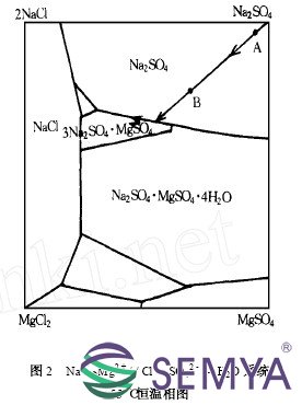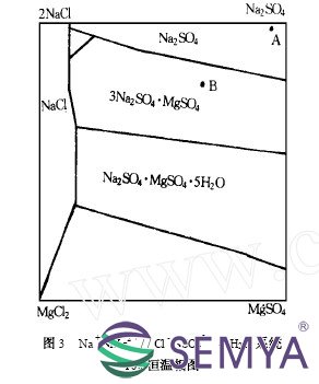 無水硫酸鈉生產(chǎn)所使用的原料中,除了主要的Na+ 、SO42 -離子外,一般都含有少量的Ca2 + 、Mg2 + 、和Cl -離子,生產(chǎn)時蒸發(fā)器內(nèi)壓力、溫度等條件保持不變,隨著蒸發(fā)的進行,結(jié)晶的硫酸鈉不斷取出, 料液中Ca2 + 、Mg2 + 離子濃度相對增大, 體現(xiàn)在Na + 、Mg2 + // Cl -、SO42--H2O 相圖上,如開始在A 點,生產(chǎn)一段時間后體系移到B 點見圖2, 繼續(xù)生產(chǎn),體系逐漸由Na2SO4 的結(jié)晶區(qū)移到Na2SO4 與復(fù)鹽3Na2SO4 ·MgSO4 的共飽線上,此時無水鈉鎂礬開始析出,在操作溫度不變情況下,體系將沿此共飽線移動,產(chǎn)品質(zhì)量開始下降。如果溫度升高時,Na2SO4 的結(jié)晶區(qū)逐漸縮小,而3Na2SO4 ·MgSO4 的結(jié)晶區(qū)逐漸增大, 體系落在了3Na2SO4 ·MgSO4的結(jié)晶區(qū),顯然此時已不是我們所需要的產(chǎn)品了見圖3 。由于無水鈉鎂礬的結(jié)晶顆細小,在粘度較大的硫酸鈉溶液中不易沉降,蒸發(fā)罐內(nèi)就會呈現(xiàn)糊狀,使蒸發(fā)無法正常進行,結(jié)晶也不會再繼續(xù)長大,排出的料液經(jīng)離心機脫水非常困難,濕硝中母液含量較大,氣流干燥也無法正常運行,產(chǎn)品放置時間長了便結(jié)為大塊。為避免上述現(xiàn)象發(fā)生,除對硝液進行凈化外,應(yīng)適當(dāng)降低排料溫度,即降低蒸發(fā)終溫。從圖2 、圖3 中可以看出,Na2SO4的結(jié)晶區(qū)隨著溫度的降低而增大,這不僅提高了產(chǎn)品產(chǎn)量,而且極大的降低了雜鹽的析出量,大大提高了產(chǎn)品質(zhì)量。那么是不是排料溫度越低越好呢? 也不是,圖4 是Na2SO4 -H2O 系統(tǒng)相圖,從圖中可以看出,硫酸鈉溶解度在32138 ℃最大,低于此溫度時,系統(tǒng)不再結(jié)晶Na2 SO4 , 而是結(jié)晶出Na2 SO4 ·10H2O 。當(dāng)料液溫度接近32138 ℃時, 由于硫酸鈉溶解度增大,產(chǎn)量將受到影在水中響, 這對生產(chǎn)是不利的。